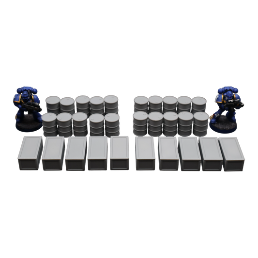 Oil Barrels x20 + Crates x10 - 28mm Wargaming Scatter Terrain Scenery Tabletop
