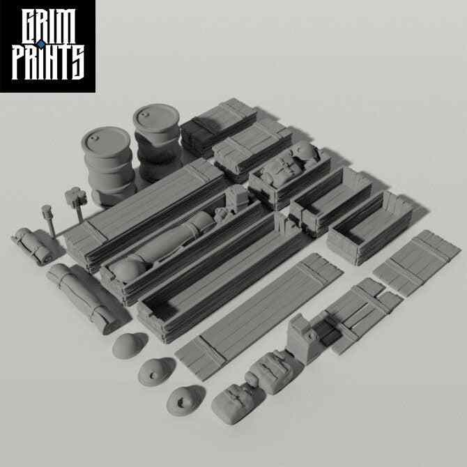 Crafted with the utmost attention to detail, each piece in this set is a miniature marvel. The set of stowage items for your Grim tanks. Set includes; 2 barrels, a bedroll, a rolled tarp, 2 create designs with optional lids and contents, 1 large crate design with optional lid and contents, 3 helmets, 1 jerry can, 2 back packs, 1 potato masher, 1 quad-potato masher.