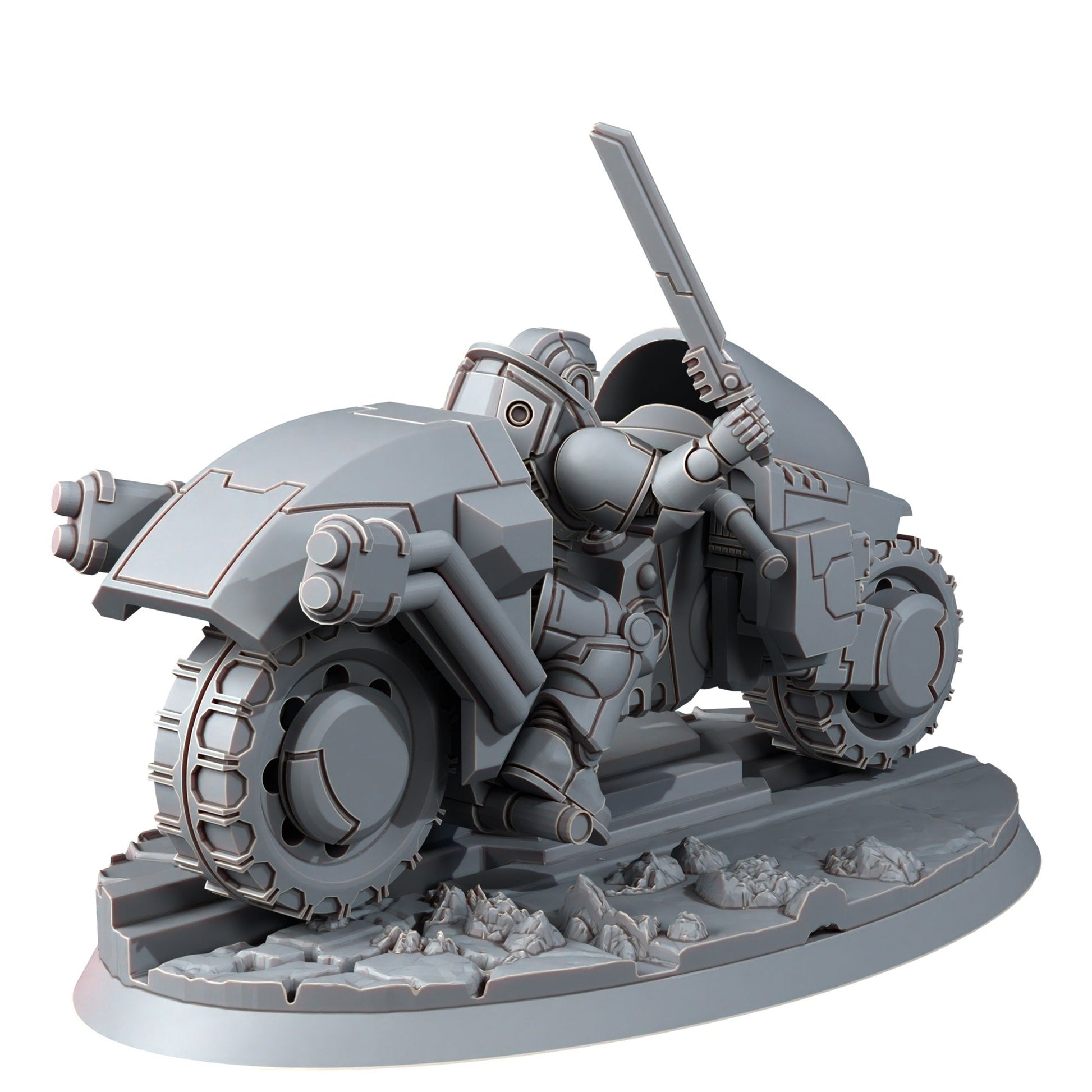 The miniature showcases a sleek, futuristic bike with a fully armored supersoldier at the helm, ready for action. Ideal for collectors, painters, or gamers, the Riders on the Storm V1 offers a dynamic and powerful addition to any army.